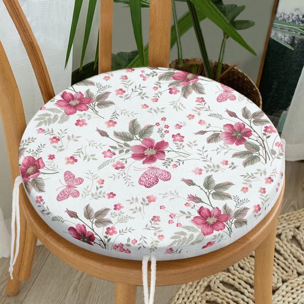 Beyaz Zeminde Pembe Çiçekler Dijital Baskılı Modern Yuvarlak Fermuarlı Sandalye Minderi