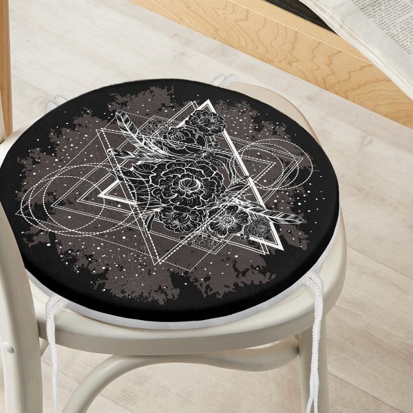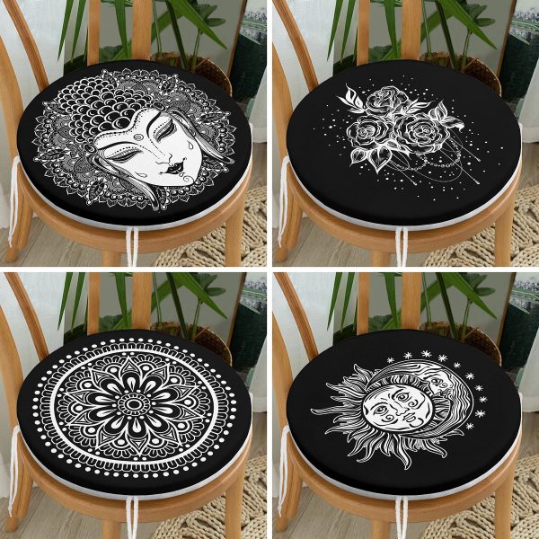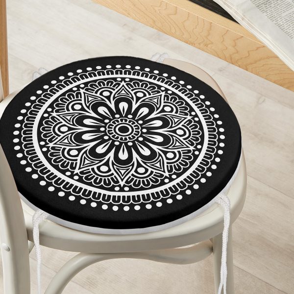 Siyah Beyaz Çiçek Desenli Mandala Motifli Yuvarlak Fermuarlı Sandalye Minderi