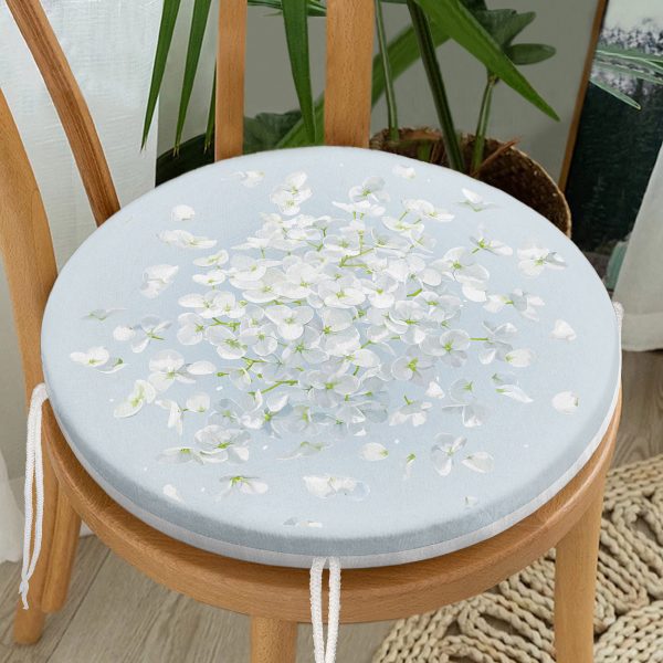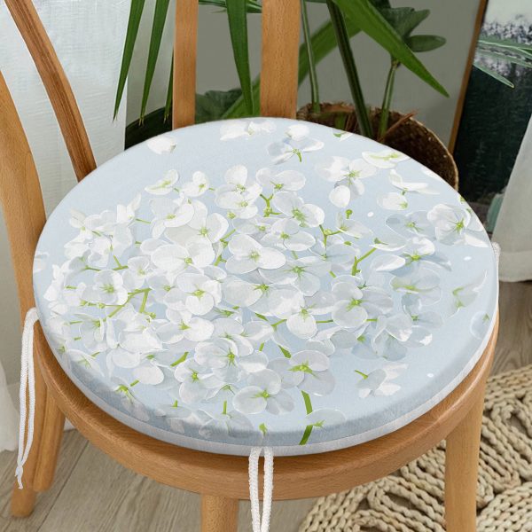 Mavi Zeminde Beyaz Ortanca Çiçeği Dijital Baskılı Yuvarlak Fermuarlı Sandalye Minderi