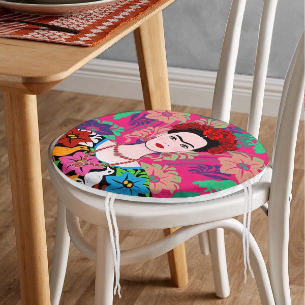 Fuşya Zeminde Frida Kahlo Motifli Özel Tasarım Yuvarlak Fermuarlı Sandalye Minderi