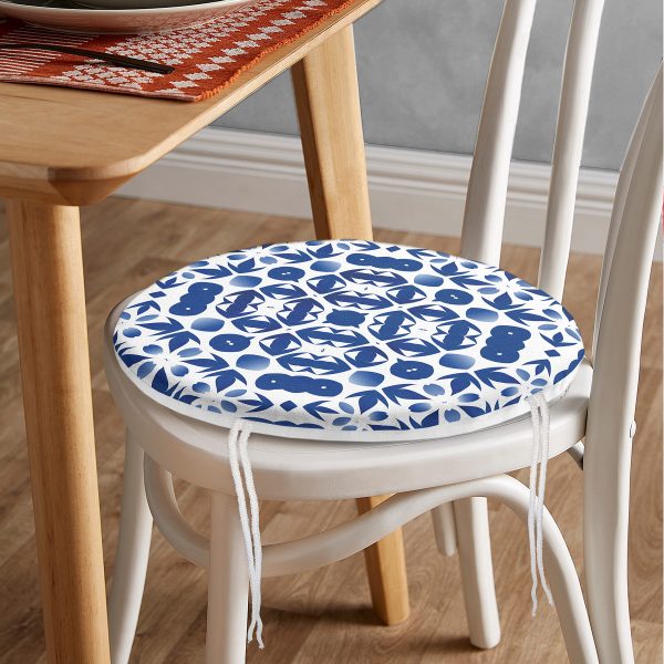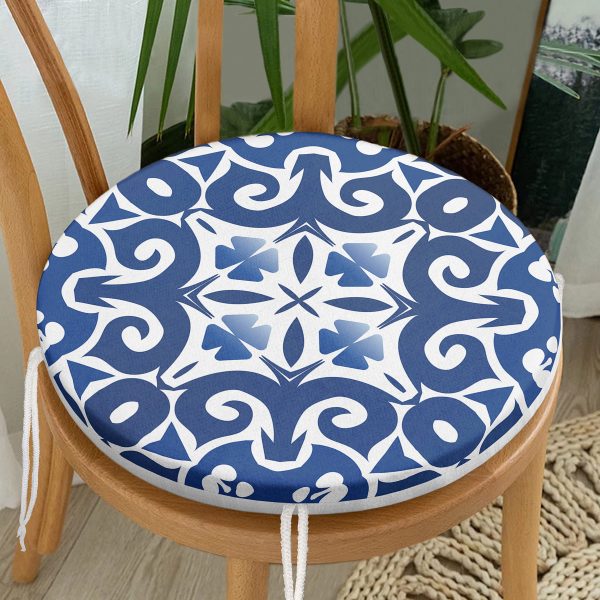 Mavi Zemin Üzerinde Çini Desenli Dijital Baskılı Modern Yuvarlak Fermuarlı Sandalye Minderi