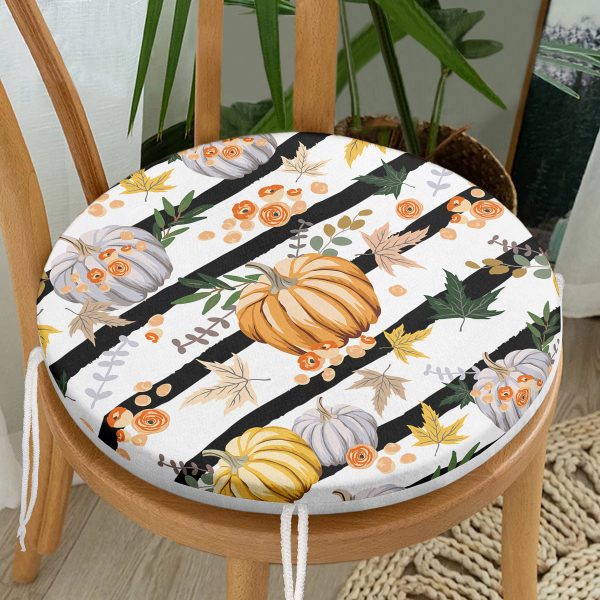Sonbahar Temalı Kabak Motifli 4 Yuvarlak Pofuduk Sandalye Minderi ve 1 Runner Seti