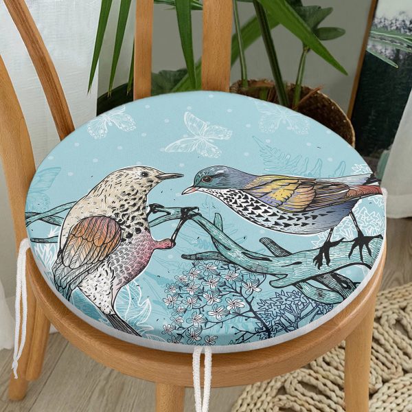 Mavi Kuş Desenli Dijital Baskılı Yuvarlak Fermuarlı Sandalye Minderi