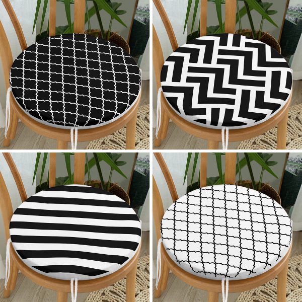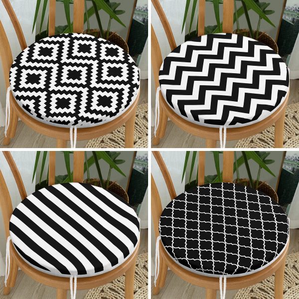 4’lü Siyah Beyaz Geometrik Şekiller Yuvarlak Fermuarlı Sandalye Minderi Seti