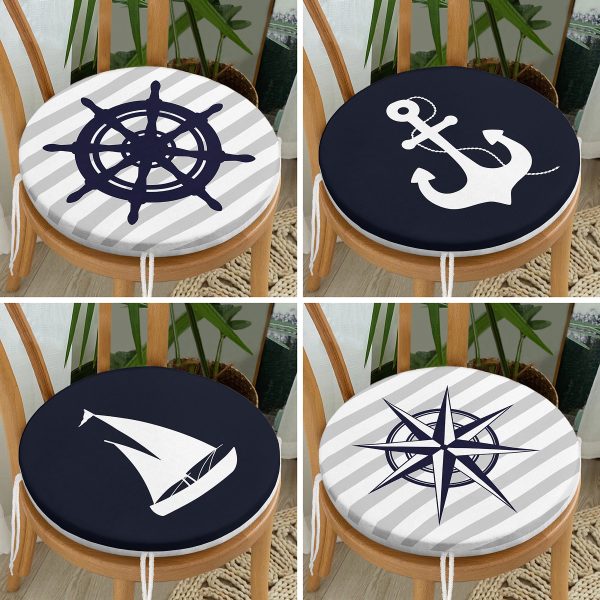 4’lü Renkli Zemin Üzerinde Denizci Desenli Modern Yuvarlak Fermuarlı Sandalye Minderi Seti