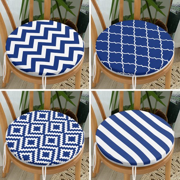 4’lü Lacivert Geometrik Çizimler Özel Tasarım Dijital Baskılı Modern Yuvarlak Fermuarlı Sandalye Minderi Seti