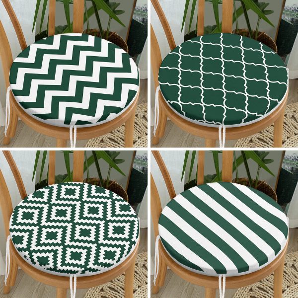 4’lü Koyu Yeşil Geometrik Çizimler Özel Tasarım Dijital Baskılı Modern Yuvarlak Fermuarlı Sandalye Minderi Seti