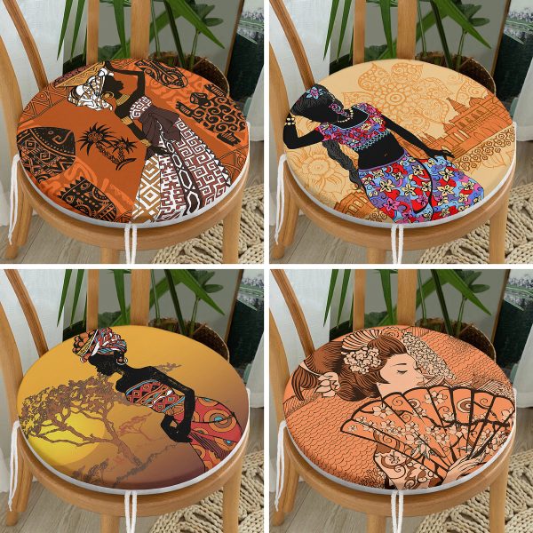 4’lü Etnik Afrika Women Desenli Yuvarlak Fermuarlı Sandalye Minderi Seti