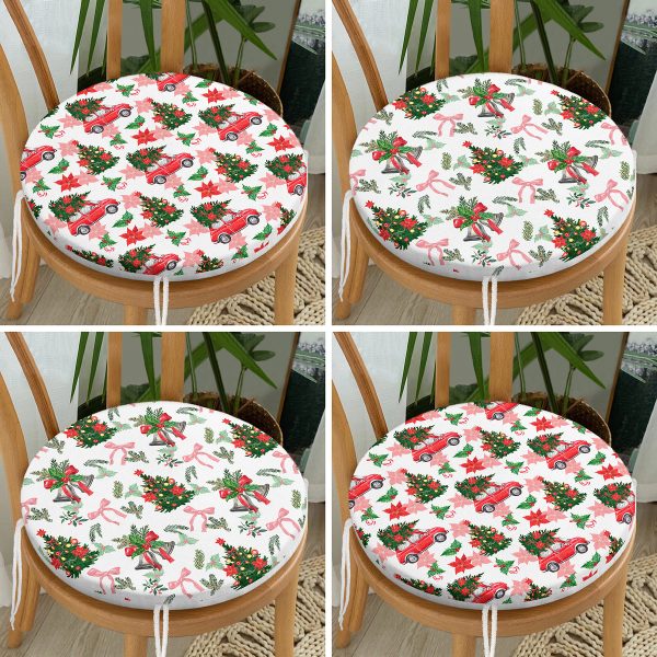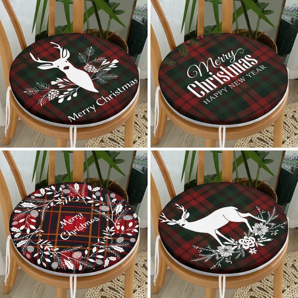 4’lü Ekose Zeminli Yılbaşı Desenli Yuvarlak Fermuarlı Sandalye Minderi Seti