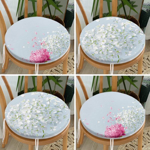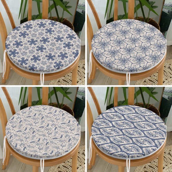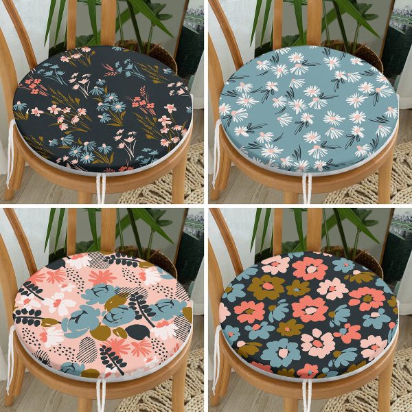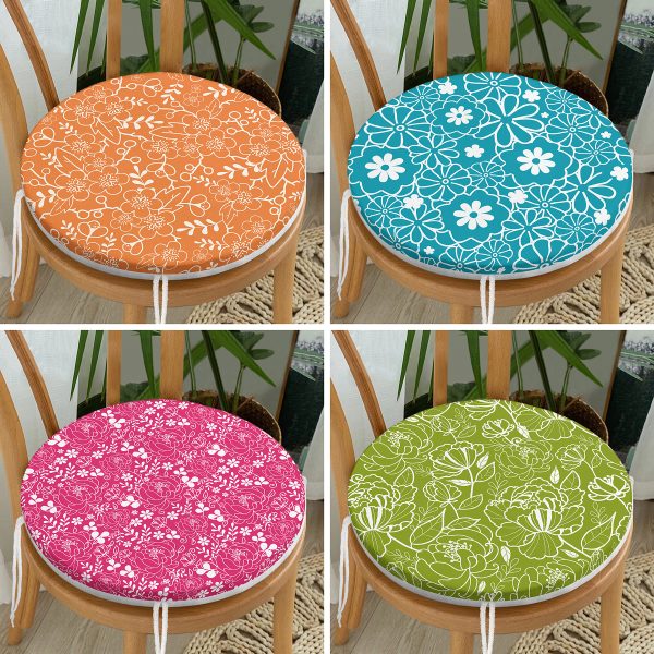 4’lü Renkli Zeminde Beyaz Çiçek Motifli Yuvarlak Fermuarlı Sandalye Minderi Seti