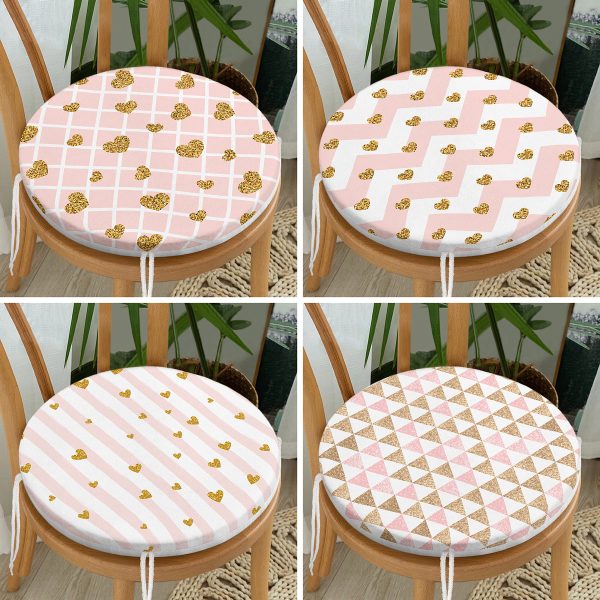 4’lü Gold Detaylı Pembe Geometrik Çizimli Yuvarlak Fermuarlı Sandalye Minderi Seti