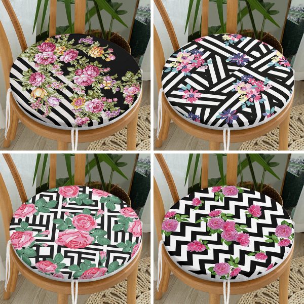 4’lü Siyah Çizgili Zemin Çiçek Motifli Yuvarlak Fermuarlı Sandalye Minderi Seti