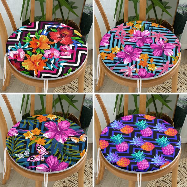 4’lü Geometrik Zeminli Renkli Tropik Çiçekler Yuvarlak Fermuarlı Sandalye Minderi Seti