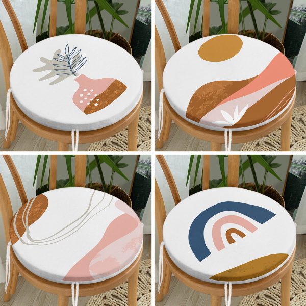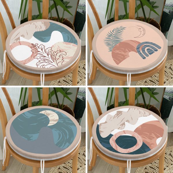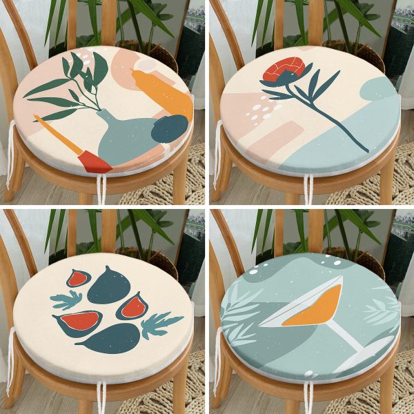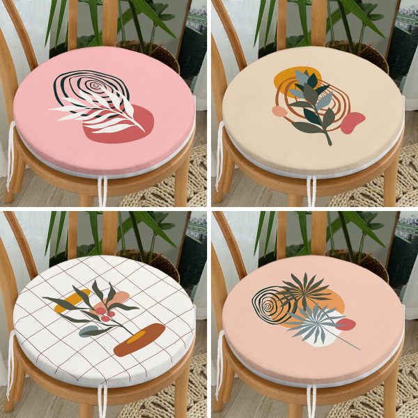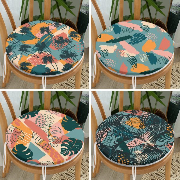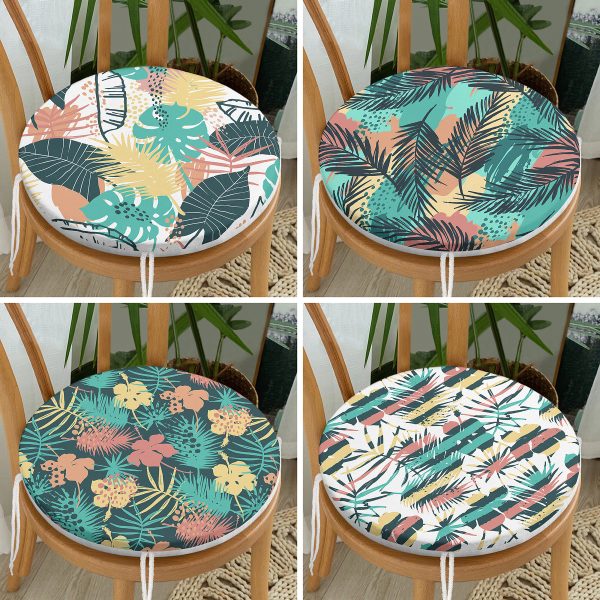 4’lü Renkli Zemin Üzerinde Yaprak Desenli Modern Yuvarlak Fermuarlı Sandalye Minderi Seti