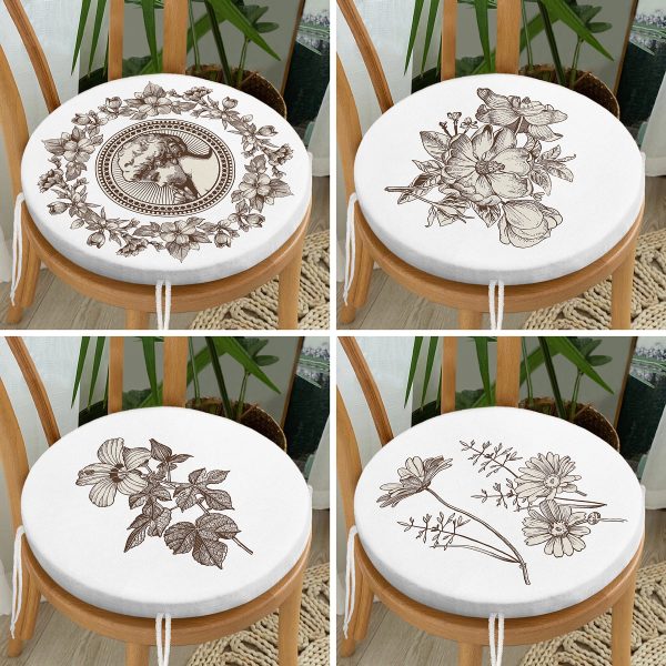 4’lü Beyaz Zemin Kara Kalem Çizimli Dijital Baskılı Modern Yuvarlak Fermuarlı Sandalye Minderi Seti