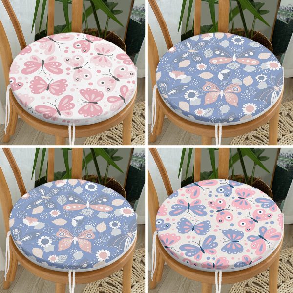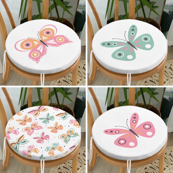 4’lü Renkli Zemin Kelebek Desenli Dijital Baskılı Modern Yuvarlak Fermuarlı Sandalye Minderi Seti