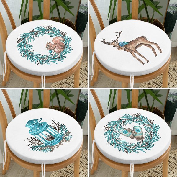4’lü Özel Tasarım Kış Temalı Dijital Baskılı Modern Yuvarlak Fermuarlı Sandalye Minderi Seti