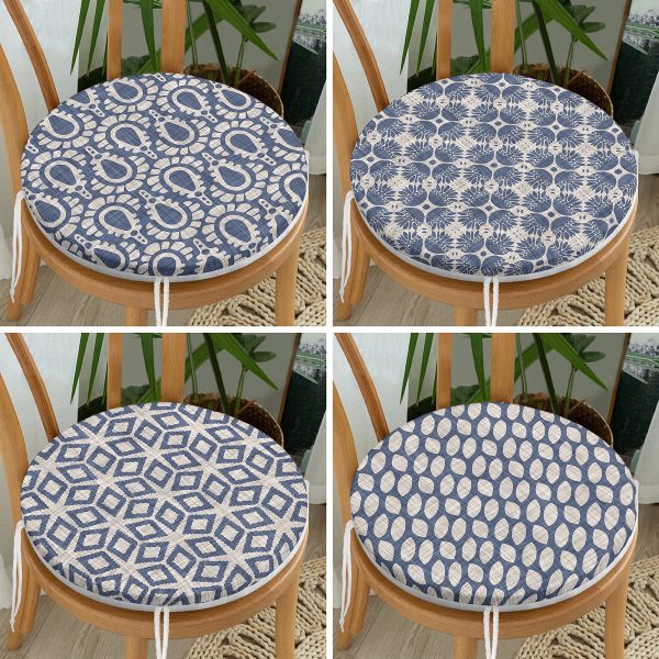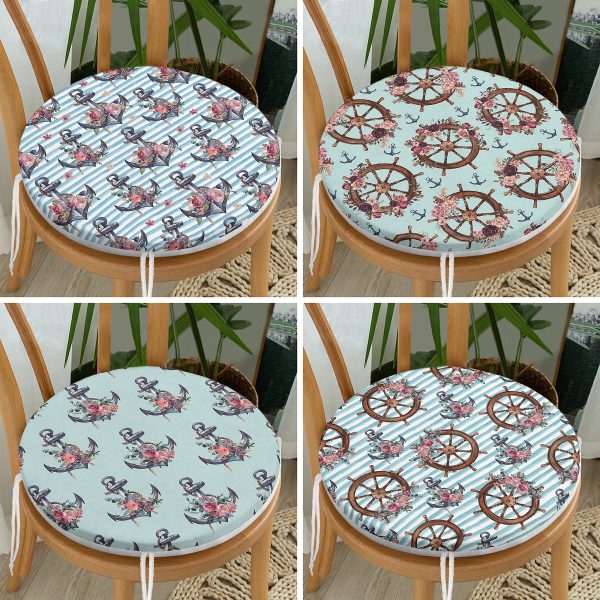 4’lü Mavi Zemin Dümen & Çapa Motifli Dijital Baskılı Modern Yuvarlak Fermuarlı Sandalye Minderi Seti