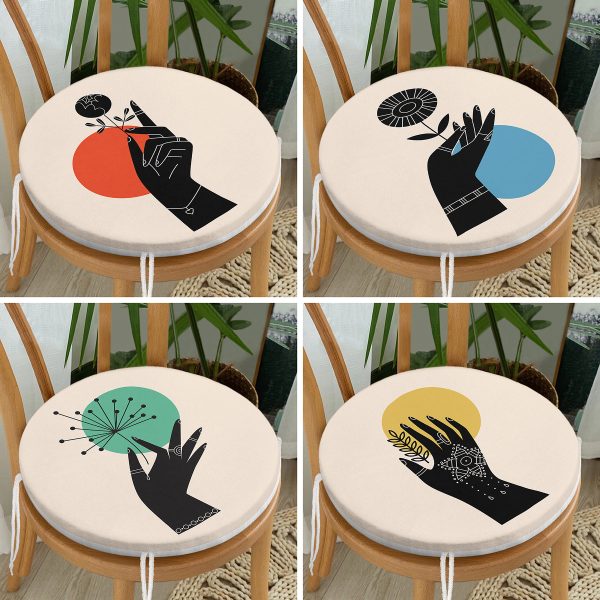 4’lü Çiçek Tasarımlı El Motifli Dijital Baskılı Modern Yuvarlak Fermuarlı Sandalye Minderi Seti