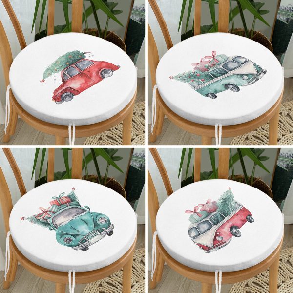 4’lü Çam Ağaçlı Araba Desenli Dijital Baskılı Modern Yuvarlak Fermuarlı Sandalye Minderi Seti