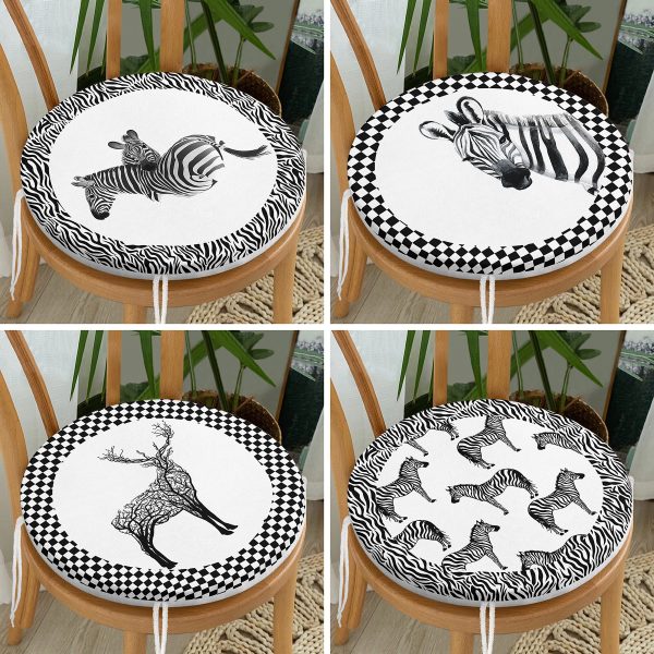 4’lü Siyah Beyaz Temalı Zebra Motifli Yuvarlak Fermuarlı Sandalye Minderi Seti