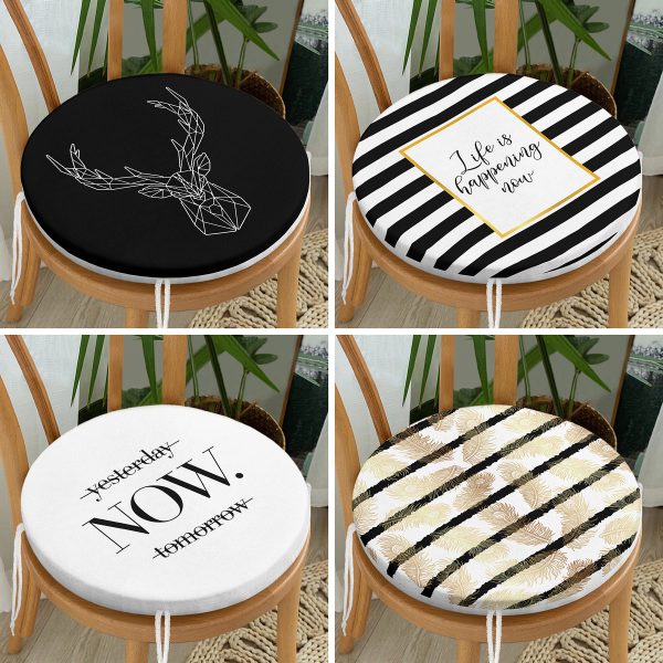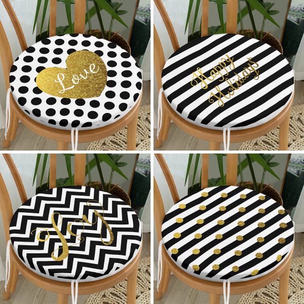 4’lü Gold Yazılı Siyah Beyaz Zeminli Yuvarlak Fermuarlı Sandalye Minderi Seti