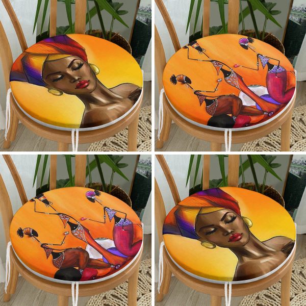 4’lü Etnik Afrika Kadın Motifli Özel Tasarım Yuvarlak Fermuarlı Sandalye Minderi Seti