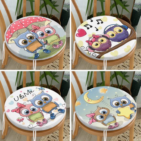 4’lü Sevimli Baykuş Motifli Yuvarlak Fermuarlı Sandalye Minderi Seti