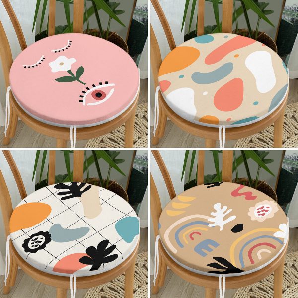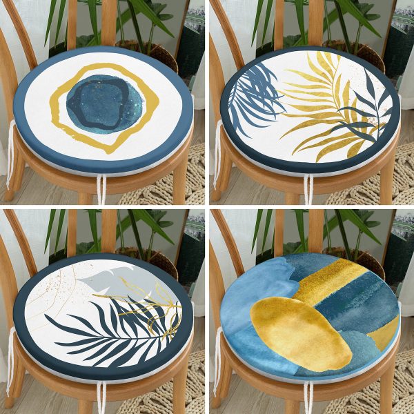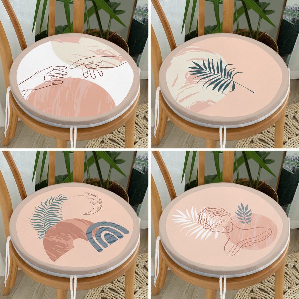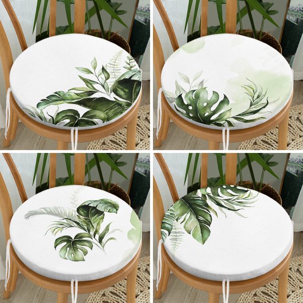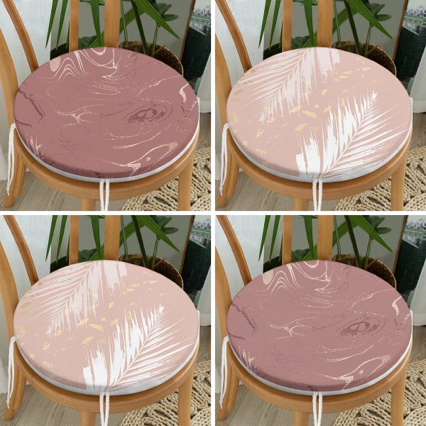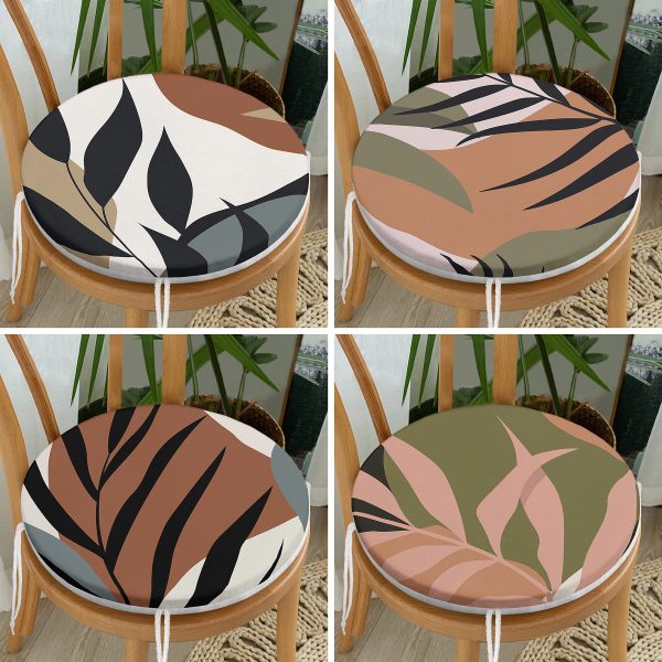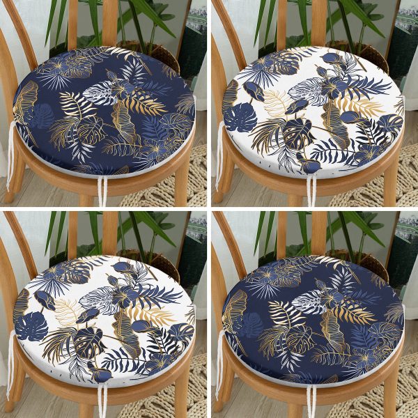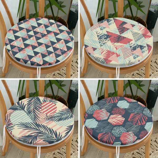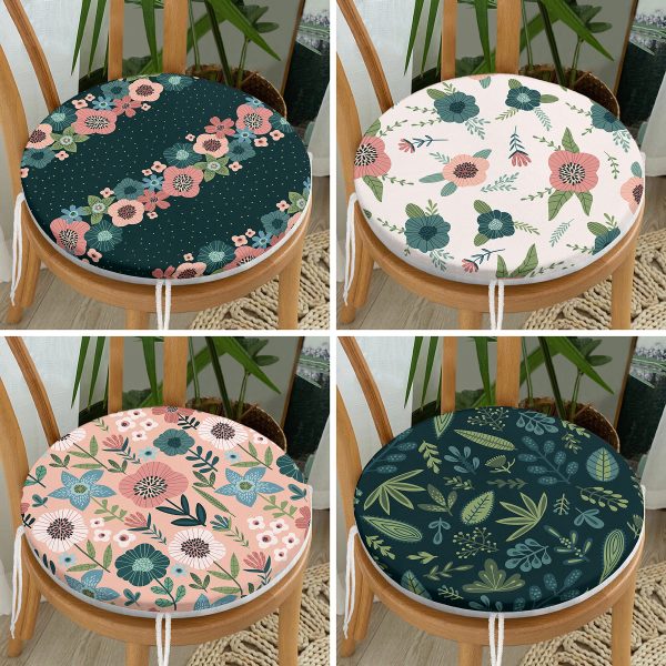 4’lü Renkli Zemin Yaprak Desenli Modern Yuvarlak Fermuarlı Sandalye Minderi Seti
