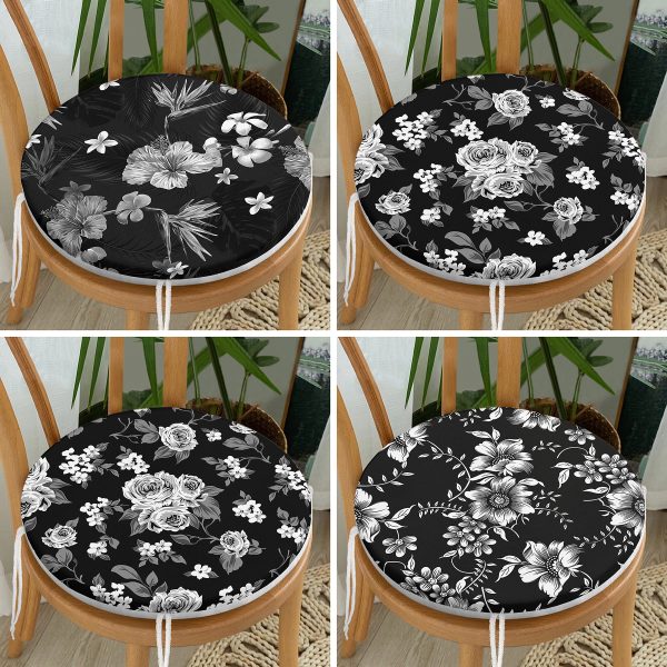 4’lü Siyah Zemin Üzerinde Çiçek Desenli Modern Yuvarlak Fermuarlı Sandalye Minderi Seti