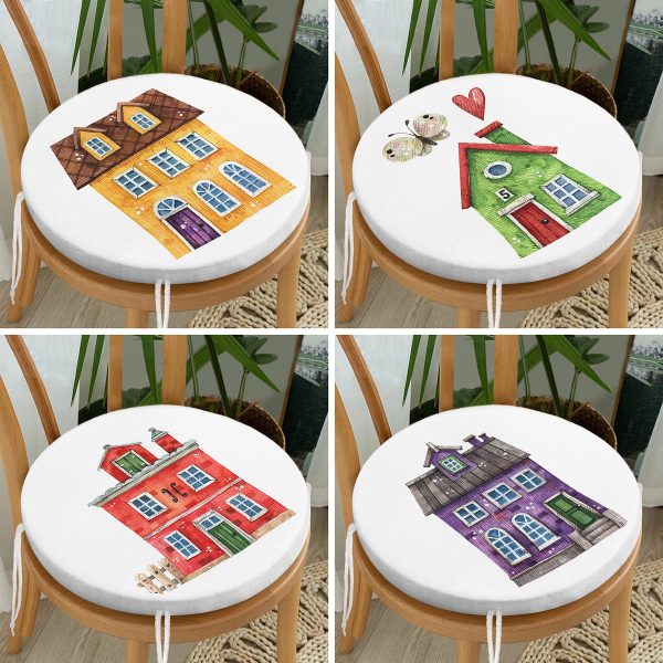 4’lü Renkli Zemin Üzerinde Çiçek Desenli Modern Yuvarlak Fermuarlı Sandalye Minderi Seti