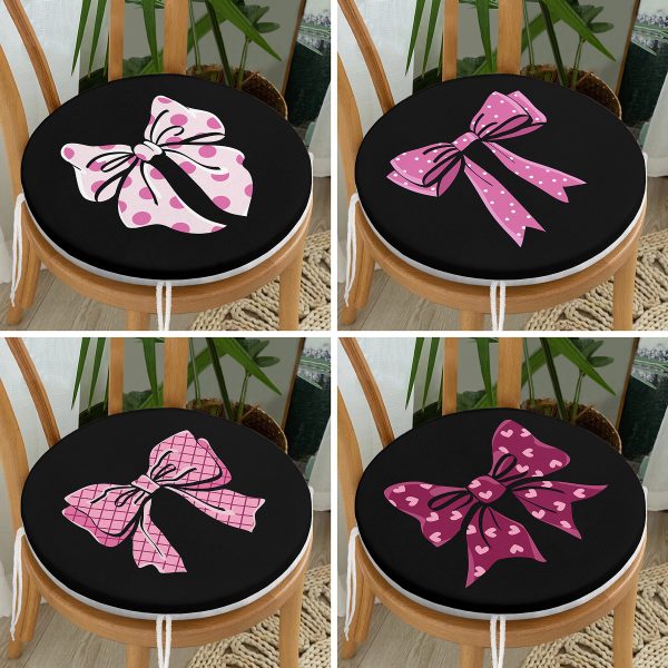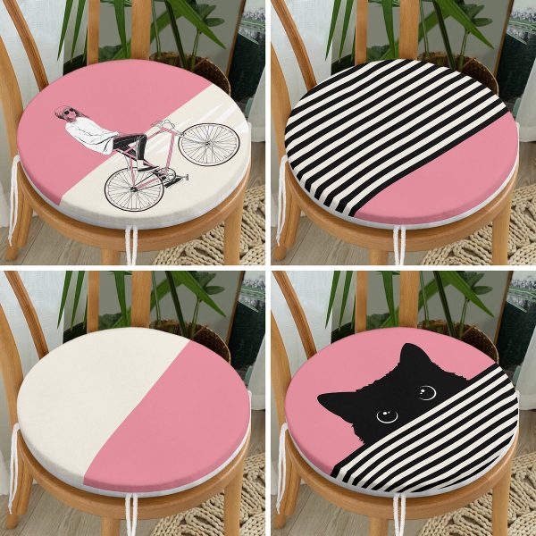 4’lü Pembe Bisikletli Adam Kedi Temalı Yuvarlak Fermuarlı Sandalye Minderi Seti