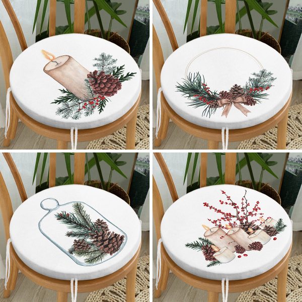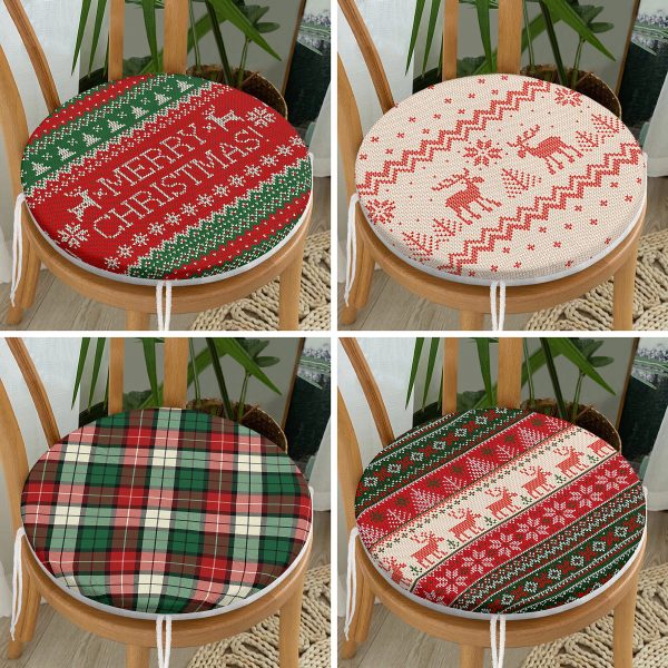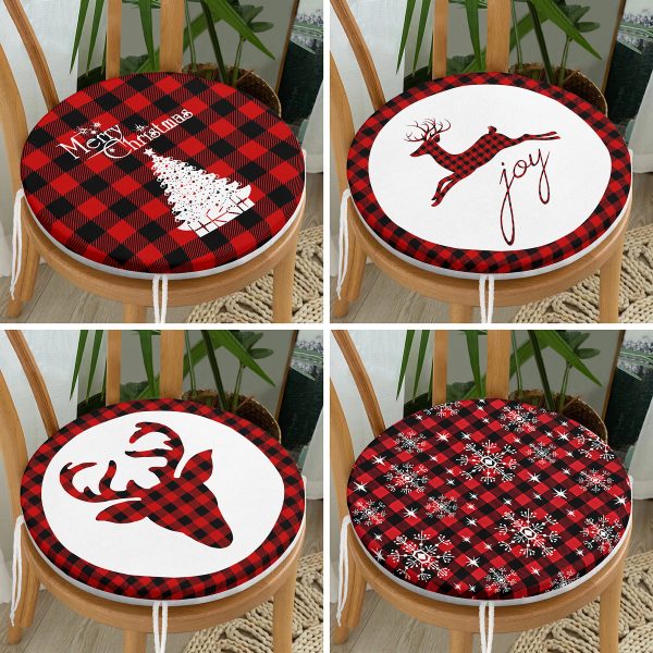 4’lü Ekose Temalı Mery Christmas Tasarımlı Yuvarlak Fermuarlı Sandalye Minderi Seti