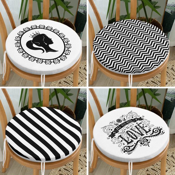 4’lü Siyah Beyaz Renkli Dekoratif Yuvarlak Fermuarlı Sandalye Minderi Seti