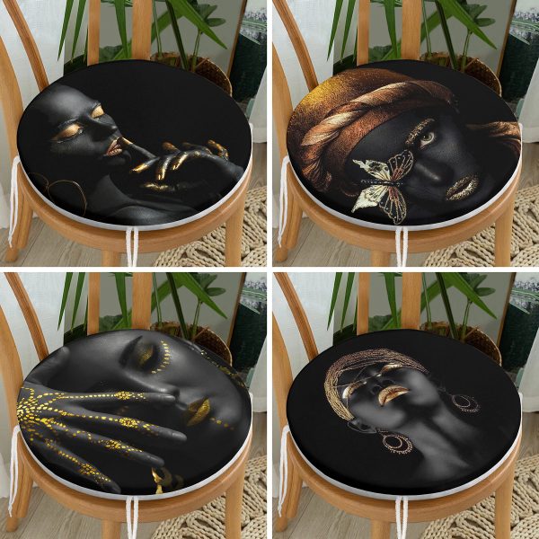 4’lü Siyah Zeminli Afrika Bayan Temalı Yuvarlak Fermuarlı Sandalye Minderi Seti