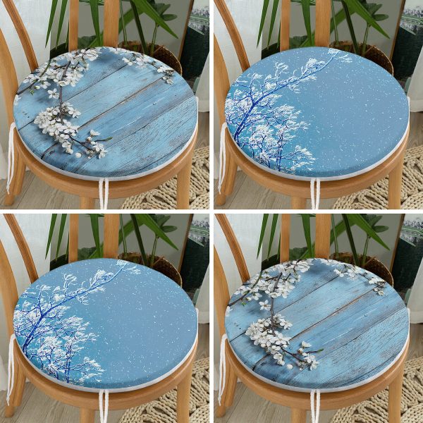 4’lü Mavi Zeminde Dal ve Çiçek Tasarımlı Yuvarlak Fermuarlı Sandalye Minderi Seti