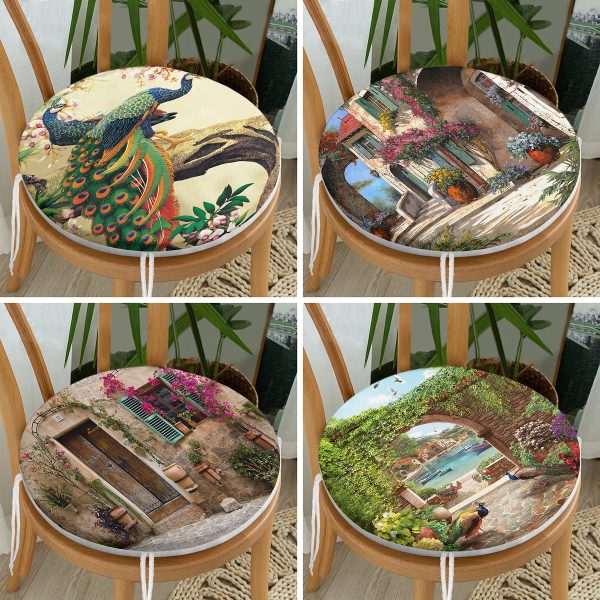 4’lü Ahşap Evler & Tavus Kuşları Özel Tasarım Yuvarlak Fermuarlı Sandalye Minderi Seti