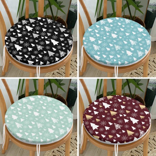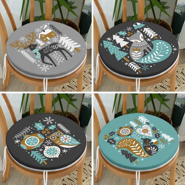 4’lü Renkli Zemin Üzerinde Yılbaşı Desenli Modern Yuvarlak Fermuarlı Sandalye Minderi Seti
