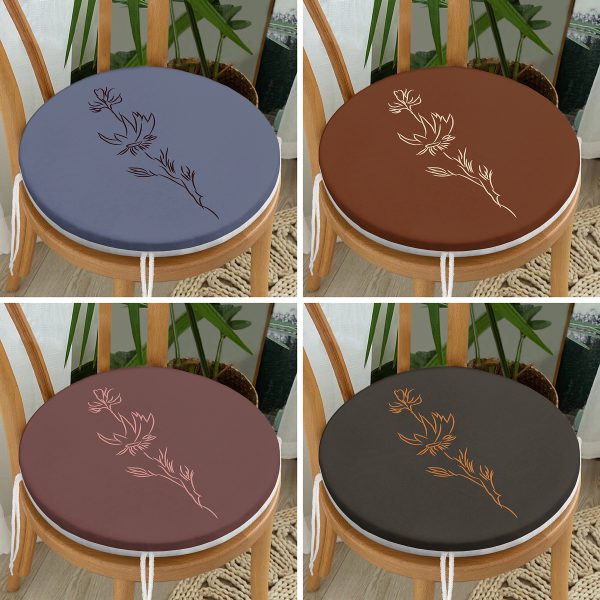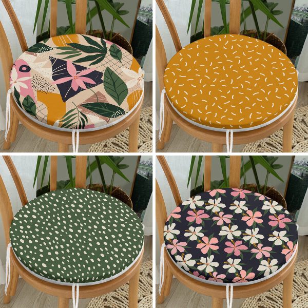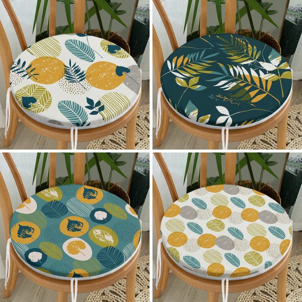 4’lü Renkli Zemin Üzerinde Yaprak Desenli Modern Yuvarlak Fermuarlı Sandalye Minderi Seti