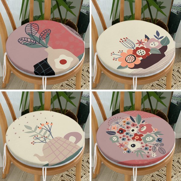 4’lü Renkli Zemin Üzerinde Onedraw Çizimli Vazo Desenli Modern Yuvarlak Fermuarlı Sandalye Minderi Seti