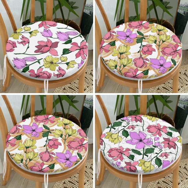 4’lü Renkli Zemin Onedraw Çiçek Çizimli Dijital Baskılı Modern Yuvarlak Fermuarlı Sandalye Minderi Seti