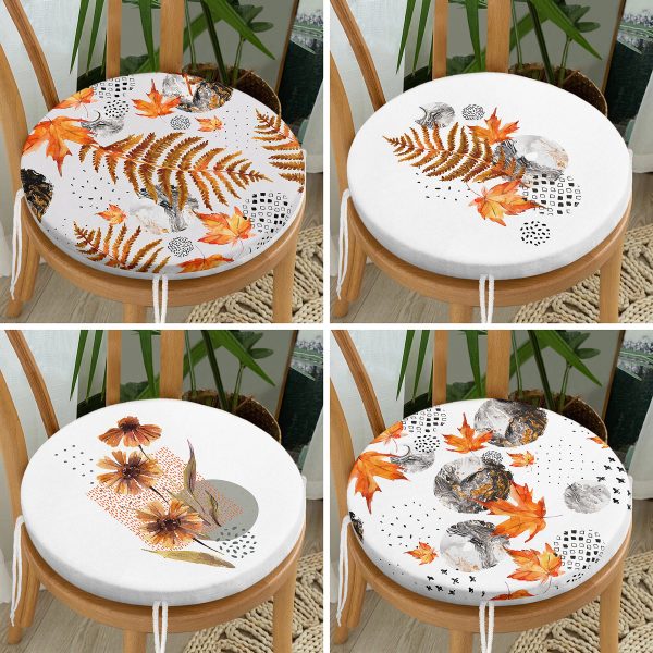 4’lü Beyaz Zemin Üzerinde Kurumuş Yaprak Ve Çiçek Tasarımlı Modern Dijital Baskılı Yuvarlak Fermuarlı Sandalye Minderi Seti
