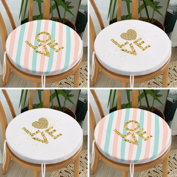4’lü Beyaz Zemin Üzerinde Gold Detaylı Love Yazılı Modern Yuvarlak Fermuarlı Sandalye Minderi Seti