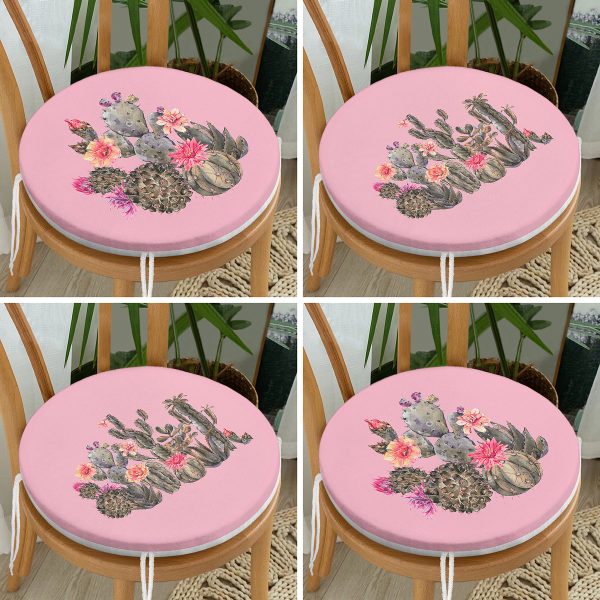 4’lü Renkli Zemin Üzerinde Kaktüs Desenli Modern Yuvarlak Fermuarlı Sandalye Minderi Seti