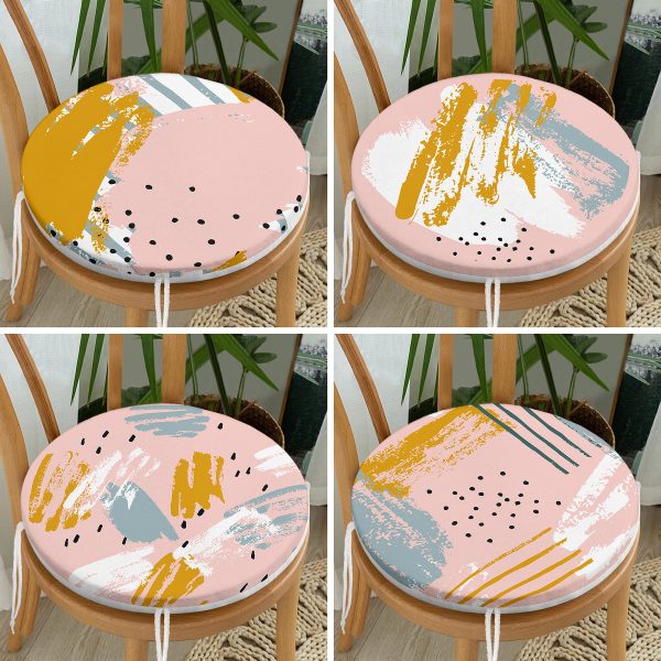 4’lü Sarı Ve Pembe Sulu Boya Fırça Darbeli Dekoratif Yuvarlak Fermuarlı Sandalye Minderi Seti