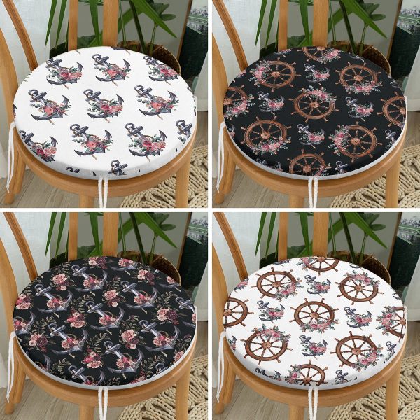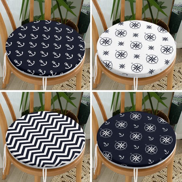4’lü Çapa ve Pusula Tasarımlı Dijital Baskılı Yuvarlak Fermuarlı Sandalye Minderi Seti