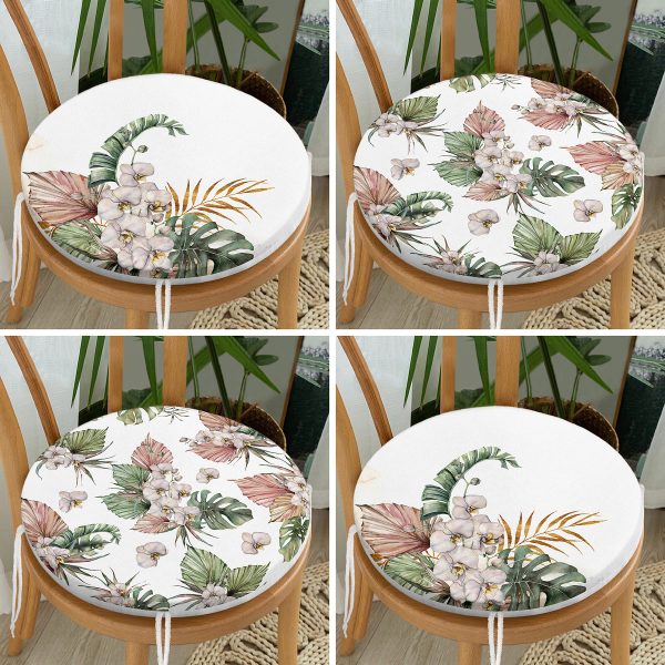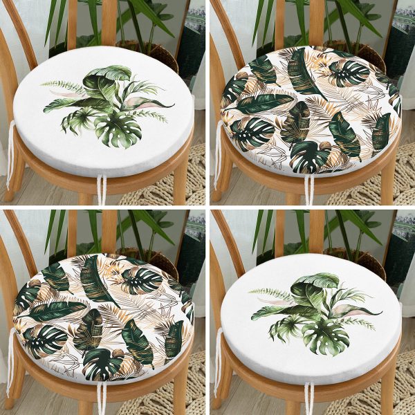 4’lü Soft Renkli Tropik Yaprak Çizimli Yuvarlak Fermuarlı Sandalye Minderi Seti