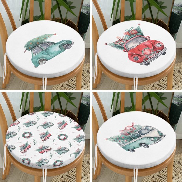 4’lü Çam Ağaçlı Araba Desenli Dijital Baskılı Modern Yuvarlak Fermuarlı Sandalye Minderi Seti