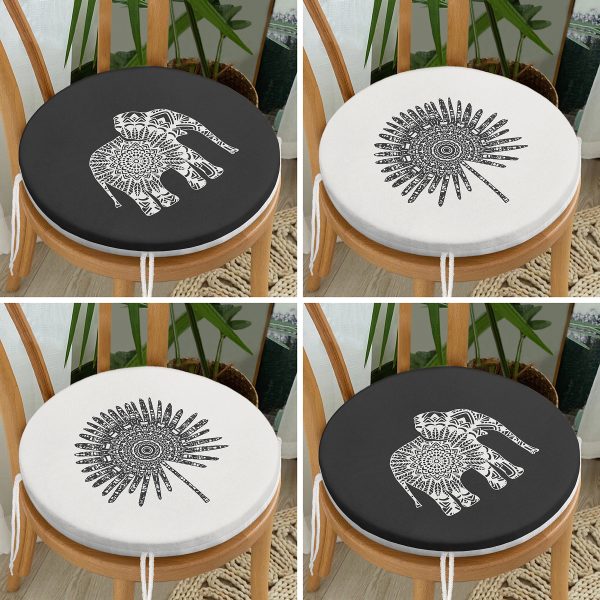 4’lü Etnik Fil Motifli Tüy Tasarımlı Yuvarlak Fermuarlı Sandalye Minderi Seti