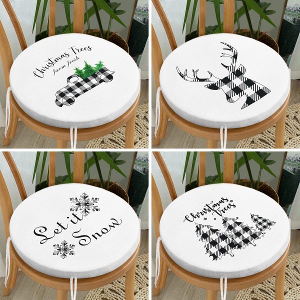 4’lü Ekose Zeminli Yılbaşı Desenli Yuvarlak Fermuarlı Sandalye Minderi Seti